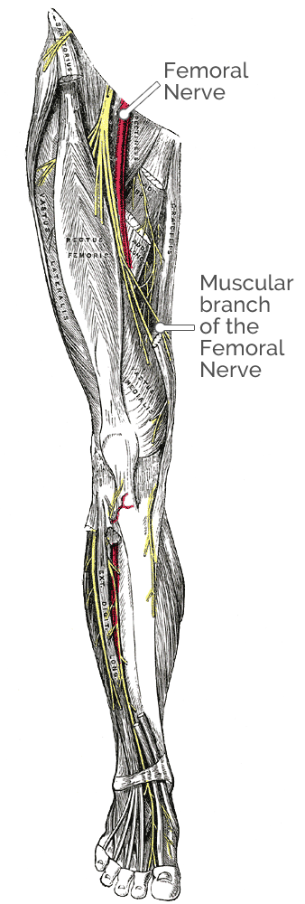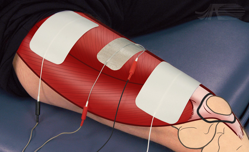 Electrode placement for knee extension dual channel for power activation. Two channels of stimulation are used with an asymmetric biphasic waveform. The negative electrode is placed very proximal and the positive lead is attached to the dual leadwire electrode placed at the mid-thigh. The channel two negative electrode is placed distally, midline to medial. The positive lead is attached to the dual leadwire electrode at the mid-thigh.