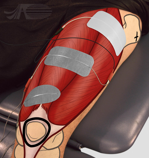 Electrode placement for knee extension stimulation dual channel for medial tracking. The greater trochanter and the patella are marked. An asymmetric biphasic waveform is used. The negative electrode for channel one is placed over the medialis oblique. The positive lead is placed in the dual channel leadwire electrode at mid-thigh.