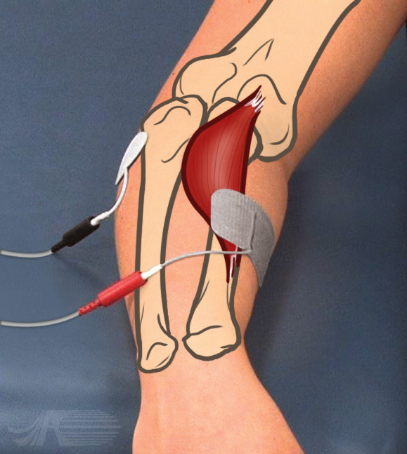 Electrode placement for forearm supination, option two. The negative electrode is still placed very proximal on the forearm near the lateral epicondyle. The positive electrode has now been placed on the flexor surface of the forearm, allowing the current pathway to pass through the supinator muscles.