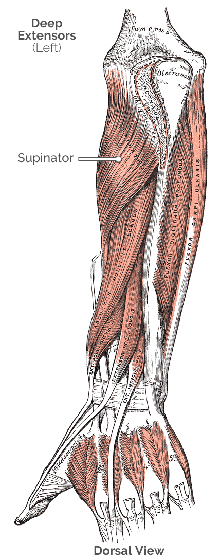 Origin: Lateral epicondyle of humerus, supinator crest of ulna, radial collateral ligament, annular ligament