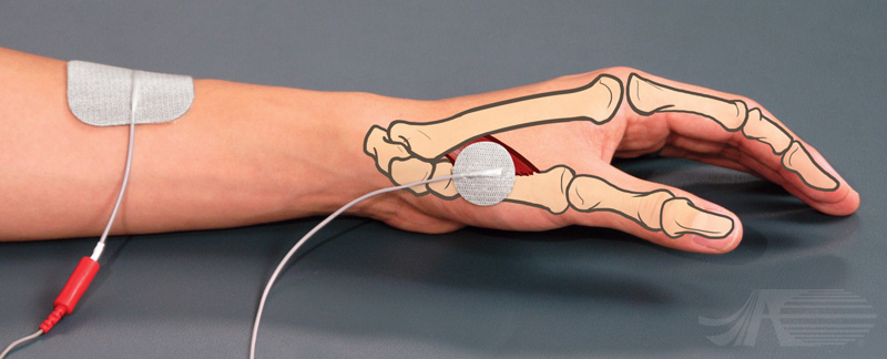 Electrode placement for thumb opposition. Although the thumb opponens is a medial muscle, it is easily accessed off the lateral border of the first metacarpal. The positive electrode is placed over the extensor surface.