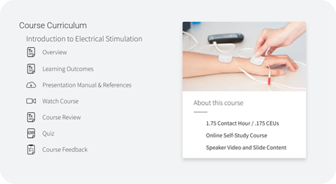 In collaboration with Salia Rehab, this course guides learners through the general considerations and specific applications and treatment techniques for electrotherapeutic interventions. Learners will review best practices for safe, effective, and efficient application of electrical stimulation modality treatments to a variety of clinical presentations. In addition, concepts associated with use of electrical stimulation in occupational performance will also be reviewed.